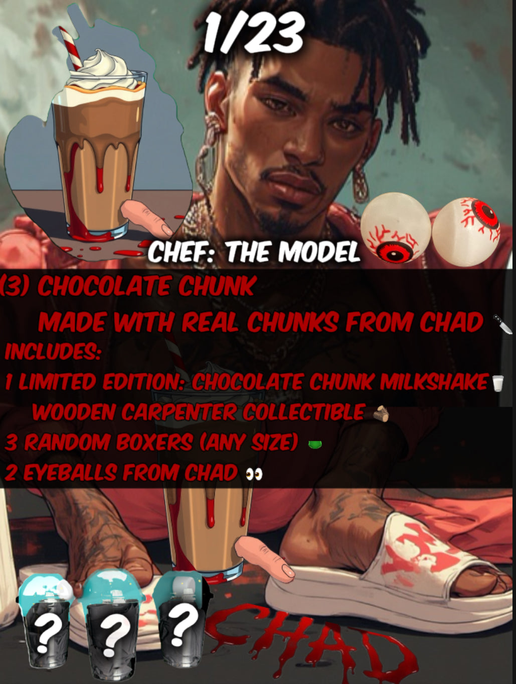 Step into the Tristan Hunt CA universe with a blind box that blends fashion, horror, and collectibles. Every set contains 3 unique pairs of premium boxers from our shop, each individually sealed in a clear milkshake cup for a satisfying, display-worthy unboxing. Your mystery “chef” (a character from our comic) determines the milkshake flavor—and the limited edition collectible inside.